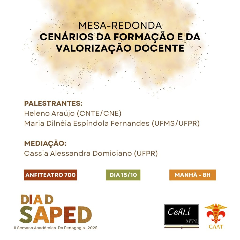 A mesa “Cenários da Formação e da Valorização Docente” compõe as atividades do Dia D do Setor de Educação no ano de 2025 e ocorre no âmbito da Semana Acadêmica do Curso de Pedagogia. Destinada a docentes e estudantes da UFPR, tem como objetivo trazer discussões em torno das adaptações curriculares necessárias em virtude da Resolução nº 04/2024, do Conselho Nacional de Educação, bem como das perspectivas sobre o futuro da docência em um cenário de desvalorização, desinteresse e desistência da carreira. Mais do que nunca, é necessário lutarmos por uma profissão docente valorizada e atrativa para novos profissionais!