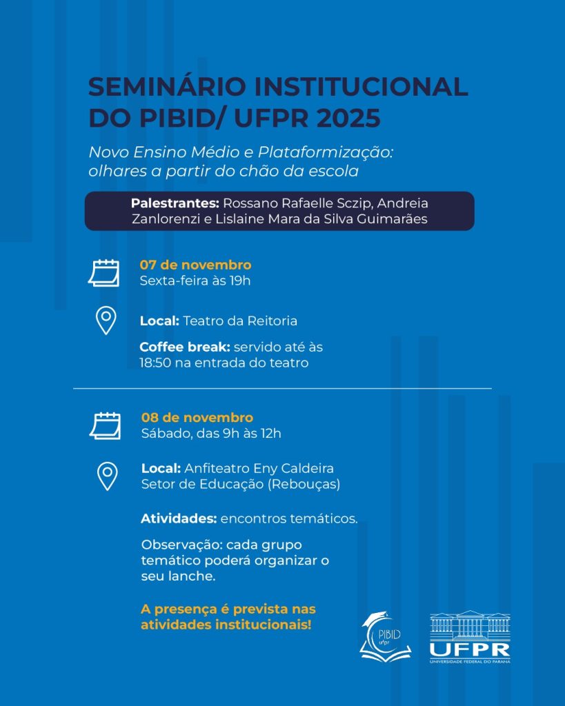 A Universidade Federal do Paraná (UFPR) promove, nos dias 07 e 08 de novembro, o Seminário Institucional do PIBID/UFPR 2025. O evento terá como foco central o tema: “Novo Ensino Médio e Plataformização: olhares a partir do chão da escola”.